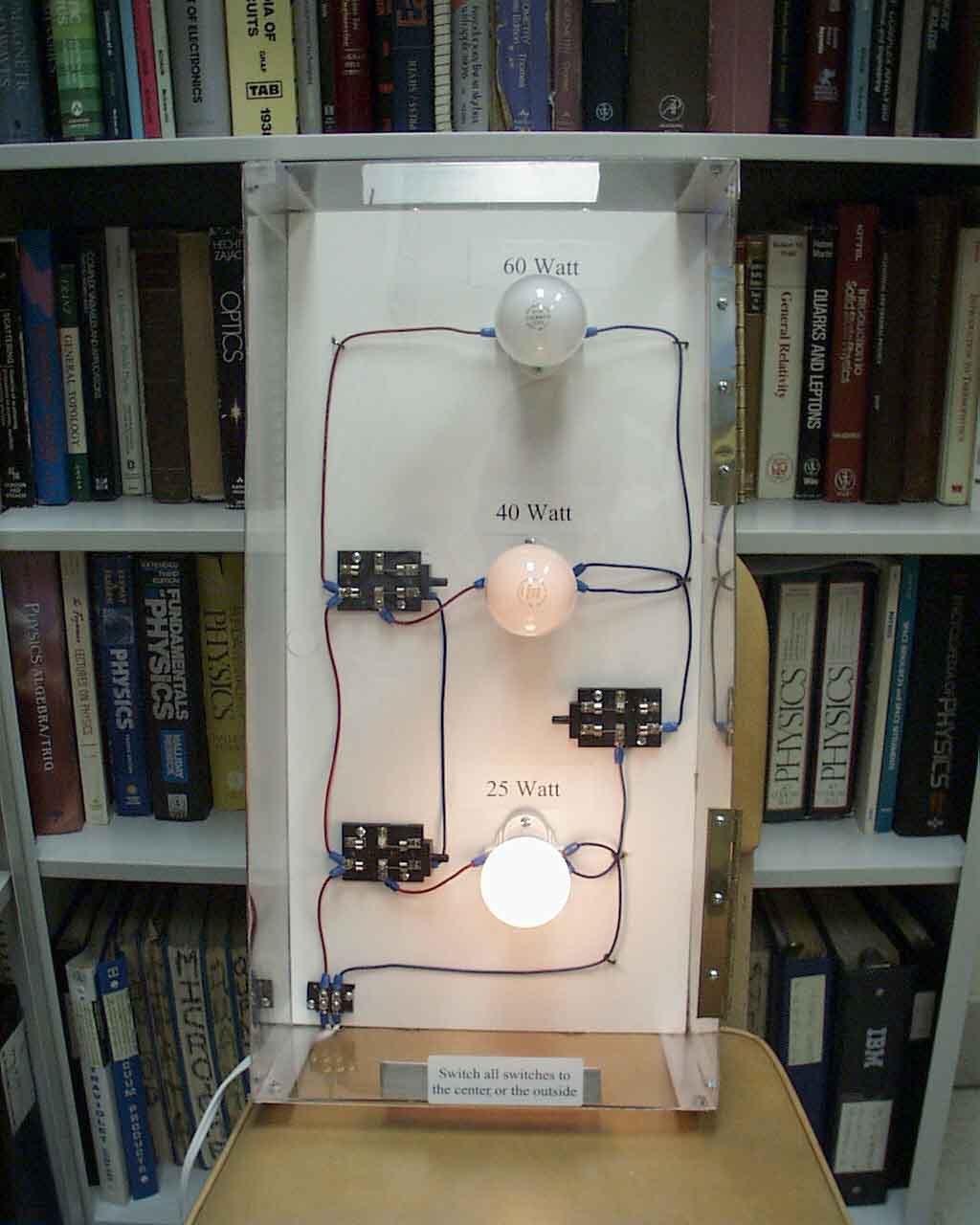 This apparatus is useful in concluding the concepts of simple parallel and series circuit analysis. Its simplicity and use of everyday components seem to be appreciated by students. The actual wattage used by the lamps in the series configuration are numerically different from the calculations due to the variance of resistance with temperature in a normal incandescent lamp, but the qualitative nature is very illustrative. Additionally, discussions about the temperature dependence can be used to compare and contrast the idealization of theory and the real behavior of circuit elements. Other lamp combinations are possible, but 60:40:25 seems to allow the clearest delineation of brightness in the series mode.