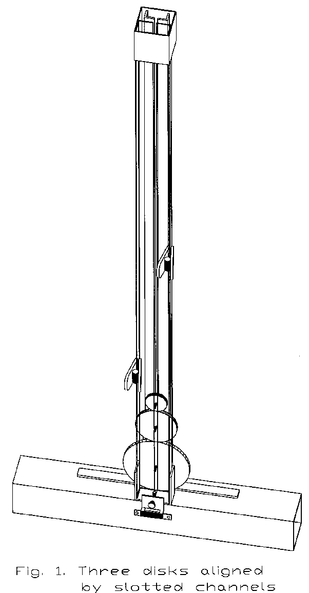 The apparatus is shown in Figure 1. The channels are vertical. The transparent slotted channel faces the audience. The transparent slotted channel can be pulled away from the aluminum slotted channel, leaving room between them to insert disks. The nail portion of a disk goes into the vertical slots of the channels. The disks are sandwiched between the transparent slotted channel and the aluminum slotted channel, one end of the nail goes through the slot of one channel and the other end goes through the slot of the other channel. Try three disks of like material. Unlatch the cabinet hinge at the base of the apparatus. Pry the plastic channel and the aluminum channel apart. Place the largest diameter disk in the slotted channel. While holding the large disk in place against the aluminum channel put the smallest diameter disk on top of the large disk. Let the transparent channel sandwich the disks in place. Let the aluminum support of the plastic channel move into place around the guide pin. Close the cabinet hinge. The two disks should now be able to move freely up and down. With a finger on the nail, lift the large disk and then let it drop. Repeat, dropping the two disk combination from ever increasing heights. Notice the small disk can gain enough energy to exit the channels into the air. Colored marking clips can be clipped at various heights on the transparent channel. Find a drop height where the small disk comes close to leaving the channels but cannot. Mark the height with a clip. Now insert the medium diameter disk between the other disks. Raise the three disk combination to the marked height. When this combination drops, the small disk gets sent out of the channel into the air. This shows that the velocity of the smallest disk can change dramatically with a stack of many disks.