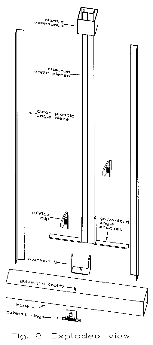 The assembled apparatus is shown in Figure 1. See Figure 2. for an exploded view of the parts. The actual dimensions of each piece are given in the materials list. The “base” is square aluminum pipe. Two “galvanized angle brackets” support two “aluminum angle pieces”. One modified piece of aluminum pipe supports the “clear plastic angle pieces”. This support is called the “aluminum U”. A “U” is made from a piece of square aluminum pipe. One side of the pipe is cut off leaving a “U” shaped piece. A slot is cut in the base of the “aluminum U”. This slot serves to guide the clear plastic channel assembly into place after changing the disks. A spring-loaded “cabinet hinge” is used at the base to keep the clear plastic channel assembly in place. The hinge has a knob installed in one of the center holes normally used for a screw. The aluminum angle pieces and the plastic angle pieces are held in place at the top of the apparatus by a small section of “plastic downspout” material. The disks, shown in Figure 1., are made of Sintra (expanded PVC) plastic. A nail is driven through a one sixteenth inch diameter hole in the center of each disk. The nail extends an equal distance on each side of the disks. Plastic “office clips” are attached to the clear plastic angle. One is to mark how far the disks were raised before they were dropped. Another clip is used to mark how high a disk went after the bounce.