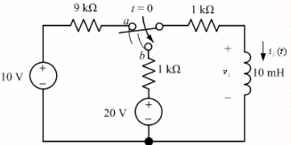The switch has been in position (a) for a long time before it goes to position (b). Find the values for the inductor voltage and current immediately after the switch closes and as time approaches infinity.