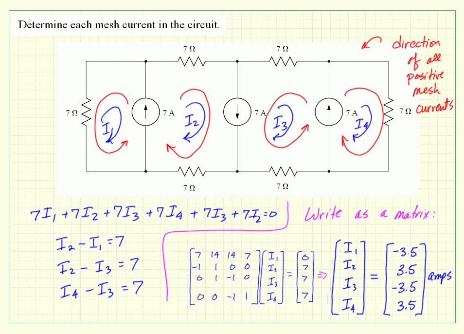 We have a supermesh here, so we only need to write one mesh equation. Relate all other meshes using the shared current sources. Write the equations in a matrix and solve for the mesh currents.