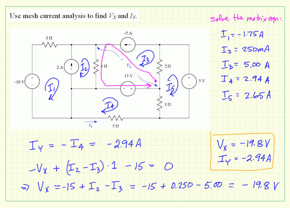 Use the concept of a supermesh to reduce the number of mesh current equations you need. Write out three mesh current equations and two supermesh relations. Use a matrix to solve the system, and then use KVL and the mesh currents to solve for Vx and Iy.
