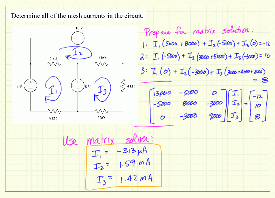 Define three mesh currents and write a KVL equation for each mesh. Use a matrix solver to solve for the mesh currents.
