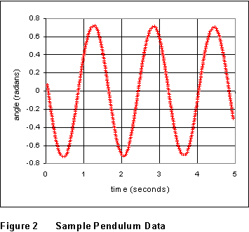 (3) Set the program so that it will take data for several complete cycles and displays 100 or so data points per cycle. Release the pendulum from an initial angle of around 30 degrees, and acquire a data set. A sample set of data is shown in Figure 2 at the right. Save your data to a file, and record the filename in your lab notebook.