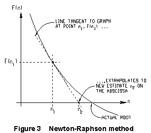 The Newton-Raphson method is one such. Suppose that a graph of F(n) vs. n looked something like Figure 3. If you had some initial guess (call it n1) for the value of n for which F(n) = 0, you could get a better guess (n2, say) by extrapolating the slope of the graph from n1 until it hits the line F(n) = 0. (The extrapolation is shown in Fig.3 by a dashed line.) We know the formula for the slope of a straight line: