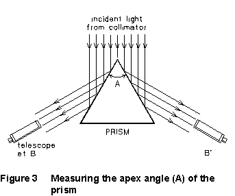 (2) Place the prism on the spectrometer table so that the apex of the prism points directly at the collimator, as in Figure 4. Re-tighten the screw. Illuminate the slit using the white (incandescent) bulb in your multiple light source, and rotate the telescope until the image of the slit, reflected from the side of the prism, can be seen. (This is position B in Figure 3). If you can't find the image, get your instructor to help you. Clamp the telescope position, and use the fine adjustment screw to set the image of the slit exactly on the cross hairs. Read and record the angular position of the telescope. Unclamp the telescope and rotate it to position B'; re-clamp it and use the fine-adjustment screw to set the cross-hairs on this image of the slit, and read and record the telescope angle. The angle through which the telescope has been rotated between B and B' is twice the apex angle (A) of your prism; you should prove this in your write-up.