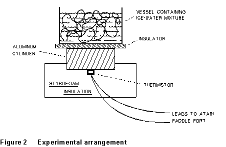 The experimental setup is shown in Figure 2. The temperature T of the aluminum cylinder will be determined by monitoring the resistance of a thermistor which is in thermal contact with it. The thermistor resistance is monitored by an ATARI computer which converts the resistance to an integer Y (PADDLE(0) number) in the range l to 228 which is proportional to the resistance. If Rl is the thermistor resistance, and Yl the corresponding PADDLE(0) integer at temperature Tl, then the resistance R and PADDLE(0) integer Y at some other temperature T are given by: