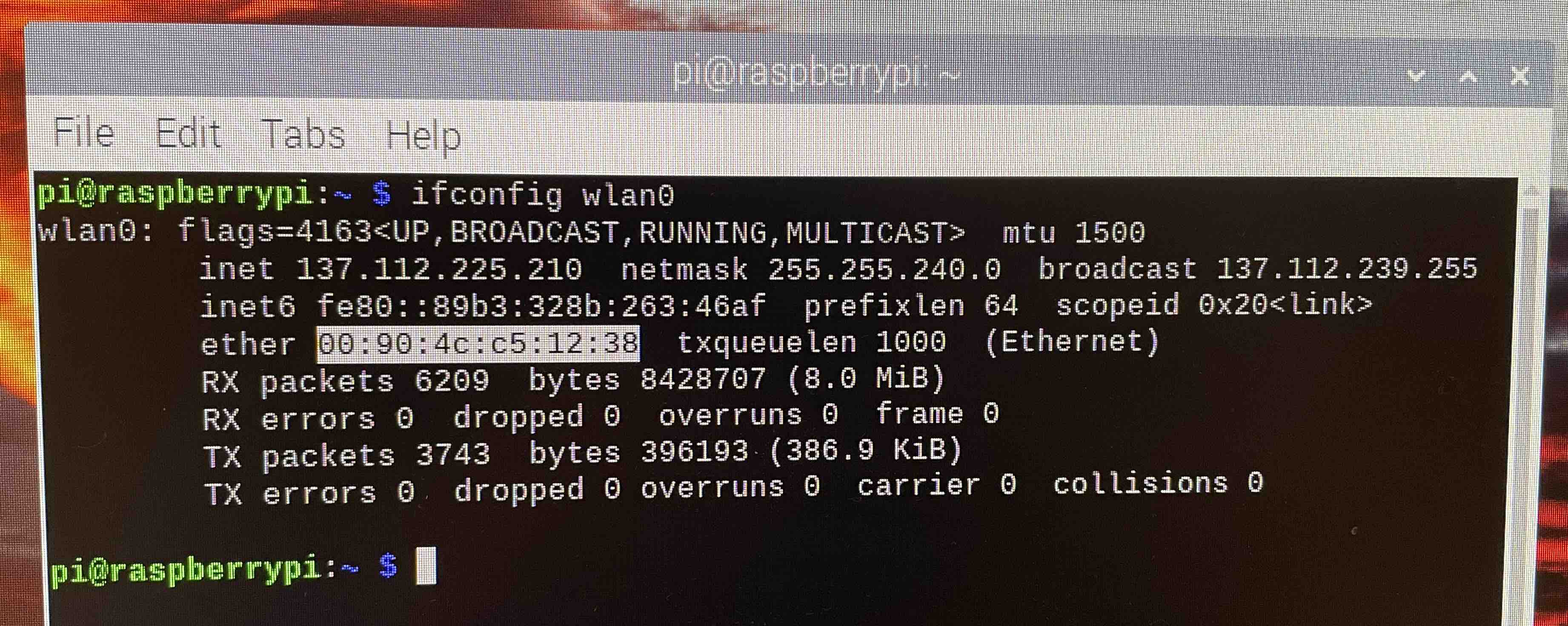 ifconfig wlan0and hit enter, or justifconfigand look in thewlan0section. Write down the address (12 hex characters) after the wordether. This is your Pi's MAC address for the wireless (wlan0) interface.