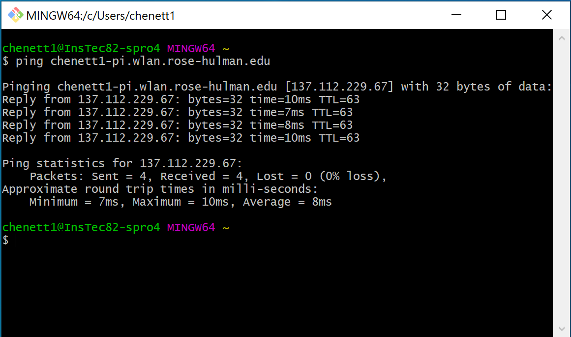 ping <rhit username>-pi.wlan.rose-hulman.edu. If you don't see something like the following, it's not connected. (To make it stop, type Control-C.)