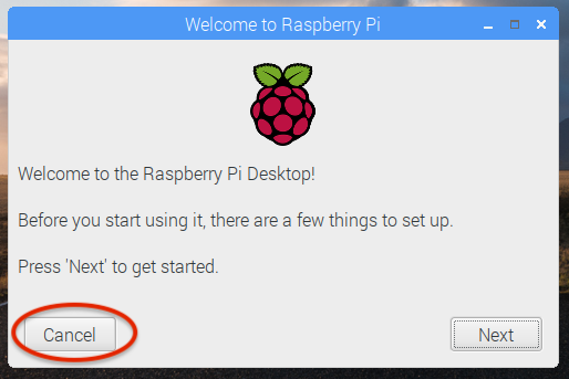 You should see the display cycle through a startup routine, ending at the Raspbian desktop. - Ignore the welcome message (you can hit cancel).
