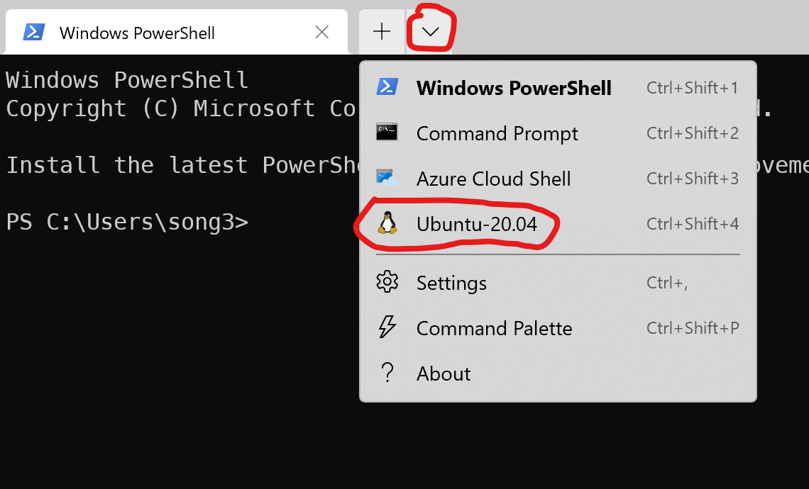 When open Windows Terminal, by default, it will open the PowerShell, which is not the thing we need. Instead, you want to find the "v" icon (drop down menu) to open Ubuntu in a new tab, as shown below.