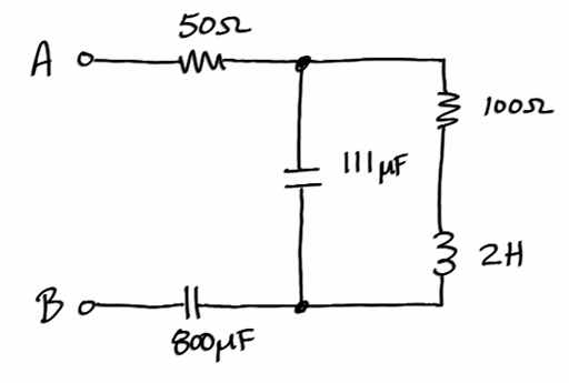 Determine the equivalent impedance at the terminals A-B when the circuit operates at a frequency of 50 rad/s.