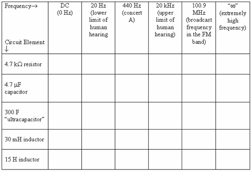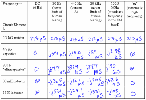 Complete the table to show the admittance of each of the indicated circuit elements at various operating frequencies.