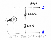Apply repeated source transformations to reduce this to an equivalent circuit at the terminals G-H. The simplified circuit will consist of a voltage source in series with two series-connected passive elements.