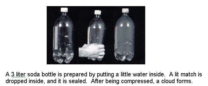 The process of cloud formation is absent from physics textbooks, yet some of the most fundamental discoveries in physics came about through its study. Although early apparatuses for producing clouds were relatively elaborate, you can instantly demonstrate cloud formation to a sizable audience with an item often found in the garbage. The common polyethylene terephthalate "clear plastic" soda bottle, some water, and a match are all that are needed. The first step is to fill a large two or three-liter soda bottle with enough water to cover the bottom, bringing it to 100% relative humidity. In the atmosphere cloud droplets form around ubiquitous motes suspended in the air, and will need to be replenished for the demonstration to be successful. In order to do this, light the match outside and after compressing the bottle, let it take in air from the environment, or just drop the lit match into the bottle. One can then just blow into the bottle and release the pressure to form a cloud. Also one can seal the bottle with a cap, and strongly grip the bottle for a few seconds. When the pressure is released, a cloud immediately forms inside the bottle, as shown below.