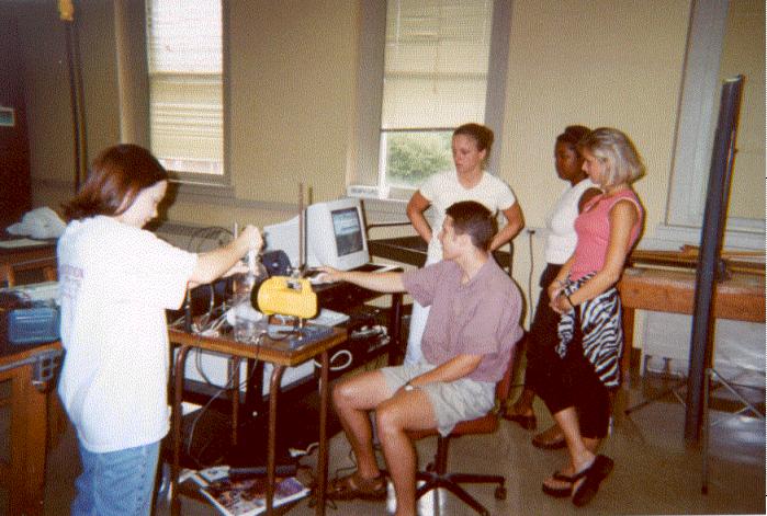 Students in a physics-for-education-majors course learn about computer-based-laboratory measurements with a PASCO 750 interface measuring the pressure, temperature, and optical transmission of a cloud formed inside a soda bottle. Right, Penni Wallace vigorously pumps the bottle after Roger Klee has begun acquiring the data. From right to left, Leslie Beaumont, Tameka Shamery, and Lindsey Couier monitor the data to see if the changes they suggested in the experiment will result in a more successful run.