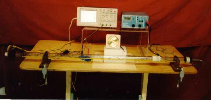 The setup reported in this paper is shown in figure 1. The resonance tube, seen in the front of the setup, consists of a graduated glass -tube of 3.62-cm internal diameter and ~110 cm in length. The movable 'closed end' of the tube is made of a metal washer of 3.5 cm in diameter. A leather washer, similar to the one used in a bicycle air pump, is placed immediately behind the metal washer to make this piston-assembly almost air tight to the small acoustic pressure, but allows it to move smoothly within the tube. The lip of the leather washer is just about flush with the face of the metal washer. The two washers are screwed slightly off center and perpendicular to the end of a 115-cm long metal rod of ~ 6mm diameter.