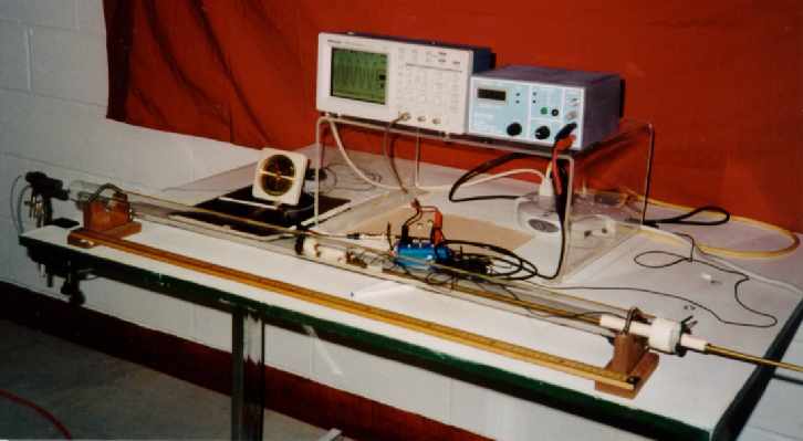 The remote end of the tube is closed with another cap. Feed-throughs are install in the cap to take the microphone signal out. Gas inlet and outlet are installed at opposite ends of the tube to allow the study the speed of sound in different gases. The complete setup as laid out on the table is shown in figure 2 (at the right).