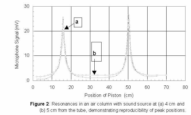 The two plots show no discernable difference in the positions of the resonance peaks even when the sound source is shifted by 1 cm. The shape of the response curves and the peak positions are almost identical. The relative peak heights are some what altered. It should be pointed out that these data are individual runs and not averaged over several trials. Also, an uncertainty of ± 0.01 cm (estimated) is inherent in the process of measurement. This uncertainty arises because of the parallax between the front edge of the piston and the scale markings on the outside of the tube.