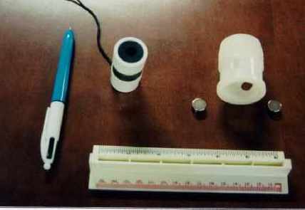 Magnetically Movable Piston The requirements for the design of the magnetically movable piston assembly are a closely fitting piston that moves smoothly inside the resonance tube and a collar that glides around it and houses two neodymium magnets. To do it without machining, one can take advantage of the multitude of PVC and other plumbing supplies. In the case described here, a PVC coupling of ½-inch nominal size and of 2.8 cm O. D. was a perfect match as a piston for our tube. The coupling is cut into two halves. A ring band (~0.75 cm wide) is cut out of a steel tube of outer diameter very close to that of the PVC coupling. In our case it is 2.7 cm. (The steel tube is of ¾ inch nominal size). A 3-cm long piece of ½ inch PVC tube is inserted into the steel band. The two halves of the coupling are cemented together with the PVC tube thereby sandwiching the steel band. The coupling is closed at one end with a suitable rubber stopper. The stopper is flushed even with the rim of the coupling. This forms the piston as shown in figure 2. Figure 2 also shows the collar and two neodymium magnets.