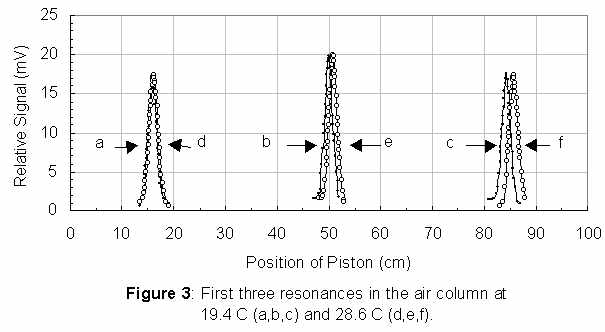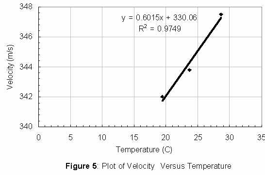 It should be noted that the speed of sound values for the two outer points in figure 5 were calculated by taking into account the first and the third resonance positions at the two temperatures. This improves the accuracy by a factor of two as compared to the results based on the first and the second resonance positions. The middle point corresponds to the average of the speeds from the two data sets of figure 2.