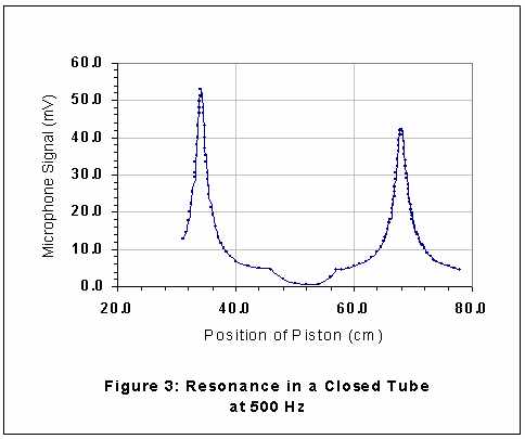 The speaker is operated at 500 Hz. The microphone signal is fed into a digital real-time oscilloscope (Tektronix model TDS 210)[5]. The signal is averaged over 128 samples and displayed. Its peak-to-peak voltage is read and the position of the piston is noted. A plot of the signal versus the position of the piston gives a resonance response curve. RESULTS AND DISCUSSION The data were collected at 16.0 °C with air in the resonance tube. Figure 3 shows a typical response curve. Resonance peaks are sharp, well defined and are separated by one half-wavelength. The speed of sound calculated from this data is found to be 339.0 m/s, which is within 0.03 % of the expected value 338.9 m/s, after correcting for the size of the tube[6,7]. The effect humidity[6] is not considered I this comparison which may add ~0.2 % to the expected value. If humidity is taken into account, the experimental value is still within 0.2%. Plots of this type are highly reproducible with response peaks within 0.5mm in the worst case. This may causes an error of no more than 2 mm in the determination of the wavelength. This amounts to a maximum error of less than 0.3 % in the determination of the speed of sound. The results given above clearly demonstrate the high degree of precision obtainable with the re-engineered resonance apparatus. Moreover, the location of the resonance peaks is determined quantitatively rather than qualitatively by listening. Instead of air, one can use any other gas. Also, this setup can be used by anyone even with hearing impairment.