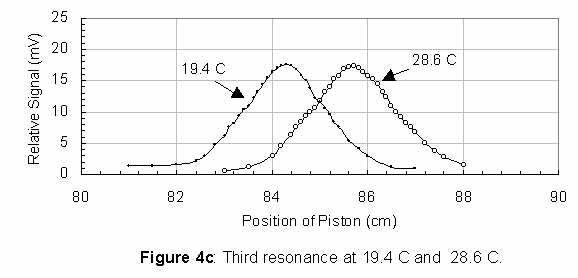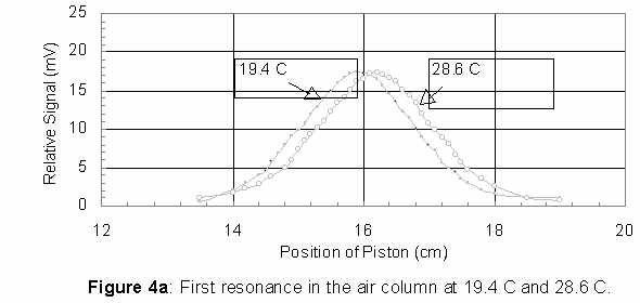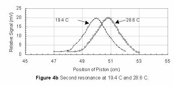 Figures 2a and 2b show typical resonance plots of the first two resonance peaks. These plots depict the data taken three days apart, with the speaker placed at 4 cm (fig. 2a) and 5 cm (fig. 2b) from the end of the tube, at 23.7 ± 0.1°C and 23.8. ± 0.1°C, respectively
