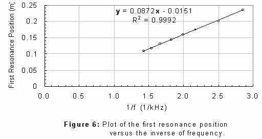 The plot of L1 versus 1/f should produce a straight line. Its slope and the intercept on the length-axis give the speed of sound (V) and the end correction Dl, respectively.