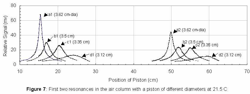 Figure 7 shows the first and the second resonance peaks at 500 Hz and 21.5 °C ± 0.5 °C with pistons of different diameters: 3.62 cm- the leak tight piston (a1, a2), 3.50 cm (b1, b2), 3.35 cm (c1, c2), and 3.12 cm (d1, d2). It shows that the resonance curves become increasingly flat and the signal height decreases as the piston diameter decreases. It also shows a sharp drop in the height of the resonance peak when the diameter changes from 3.62 cm to 3.50 cm. Also the positions of the resonance peaks shift significantly toward larger distances from the end of the tube as the piston diameter decreases. However, the distance between the first and the second resonance positions remains the same and equal to one half-wavelength. As the resonance width becomes larger so does the uncertainty in determining the position of the resonance.