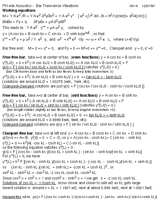 Vibration frequencies and equations - free-free, clamped-clamped, and clamped-free.