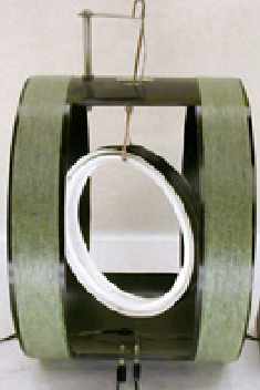 A homemade Helmholtz coil produces a uniform magnetic field along its axis. A smaller coil is connected to a 6V lantern battery is hung at the center of the Helmholtz coil. The magnetic field produced by the smaller coil causes the coil to rotate until it is aligned with the field of the Helmholtz coil.
