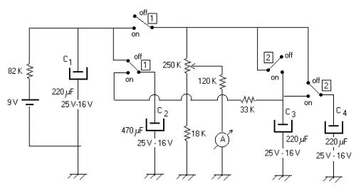 When the apparatus is reset, that is to say, when all the capacitors are discharged, putting the switch 2 in "on" position nothing is happened because capacitor C3 is discharged. When switch 1 is put in "on" position a peak of current is obtained just like before, but during this action some of charge has been transferred from C2 to C3. So by putting switch 2 in "on" position again will be a peak of current of a smaller amplitude than the first one. Maintaining switch 2 in "on" position and turning switch 1 to "on" position the amperimeter will register a peak of current as bigger as the first one. Maintaining switch 1 in "on" position during a considerable time the charge of C2 will be transferred to C3 remaining the latter charged. Turning the switch 2 in position "on" for a short time and then turning it to "off" position, it will be a peak of current. Repeating this operation in time, the peaks of current will be smaller each time. By this other block of the apparatus we simulate the production of a conditioned response. When for example, a tone is sounded (switch 2 "on") a fraction of a second before the food is presented (switch 1 "on" ) and continued so that both stimuli overlap in time. The initial salivary response again appears with presentation of the food. The effects of the paired stimuli appear with the second trial. Tone evokes salivation even before the food is presented. It is a conditioned response, one that will last for a long time.