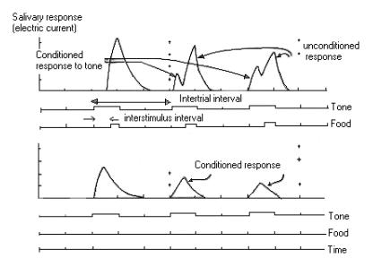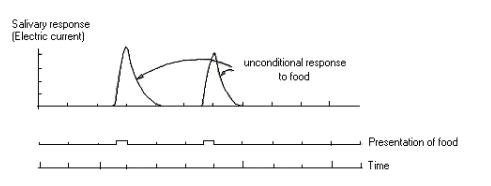 The design of this apparatus consist of two blocks which simulate the animal response to unconditional stimulus by producing salivary secretion and conditioned response for example when a tone is presented before the food. The apparatus simulates the presentation of the food to a hungry animal. The number of hours the animal has been deprived of food is simulated by the potentiometer opposing more or less resistance. By setting switch 1 in "off" position , the capacitor C1 and the capacitor C2 will charge at 9 V. Turning switch 1 to "on" position , the capacitor C1 will discharge through the circuit composed of the potentiometer, the two resistances and the amperimeter. This produce a peak of current which is proportional to the voltage in the capacitor. If the key is maintained in "on" position, the capacitor C1 will discharge to a value which is set by the resistive circuit. At the same time, part of the C2 charge will be transferred to C3 . The peak amplitude of the response can be registered by meter reading and represents the number of "drops" of saliva the animal produces. If switch 1 is exchanged from the "on" position to the "off" position, and then, from this position to the "on" one, the maximum value of the peak of current that it will be observed will depend on the frequency at which the operation is done. For low frequencies all peaks have the same amplitude but for higher frequencies the peaks have lower amplitudes. When the key 1 is in "off" position, the capacitor C1 can not charge to 9 V because its time constant is higher than the time required to exchange the switch. This means that the second exposure to the food evokes somewhat less response. The presentation of food is an unconditional stimulus for salivary response. Evokes salivation even though the experimenter has no trained the animal. The repeated presentation of the food to an even hungry animal produces successively smaller responses.