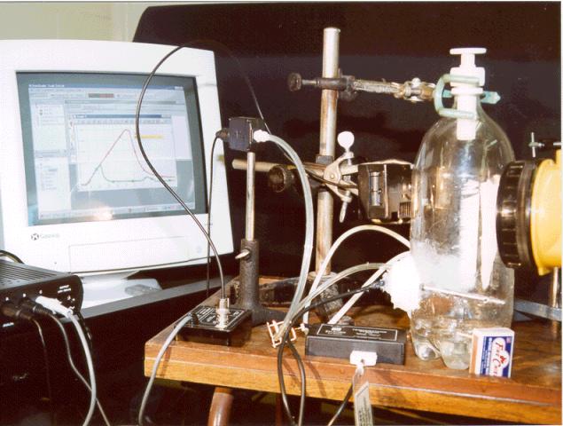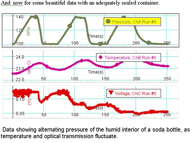 The students made several trials on the system to get a successful run, and prevailed even though the bottle sprang a leak at certain pressure (this difficulty has been eliminated with a more careful job of sealing since). One common misconception about a true Computer-Based Laboratory (CBL) is that one just clicks a button, and the computer will automatically acquire a meaningful experiment. One of the particular educational opportunities of this experiment was the very different time scales of each of the transducers. The light sensor responds so quickly that an ac light source cannot be used. On the other hand, the thermocouple responds so slowly that one must perform the experiment sufficiently slowly that it has time to "catch up" yet quickly enough so that the trial is practically adiabatic. Issues similar to those encountered in this experiment were thoroughly discussed in a recent article in The Physics Teacher by Francis X. Hart in which students investigate the solidification of lard.