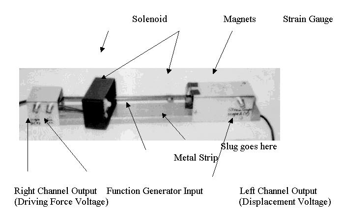 A thin metal strip (strapping steel) approximately 27 cm long, 1 cm wide and 0.3 mm thick is clamped at both ends, with one end bent sharply before it is clamped. A strain gauge is attached 1.5 cm away from the non-bent end. Two small magnets are attached at approximately L/4 and 3L/4. One magnet functions as a means of damping when an aluminum slug is placed directly under it. The other magnet, in conjunction to a solenoid placed to one side of it, serves as the driving force on the strip when a sinusoid from a signal generator is applied to the solenoid. The driving force is proportional to the current through the solenoid, which is measured through a 10 ohm serially connected resistor. There are BNC outputs for strain gauge and the voltage drop across the solenoid resistor and a BNC input for a function generator. All components are mounted on a plastic beam 37 cm long by 5 cm wide. Foam strips are placed under the beam for center-of-mass vibration damping.