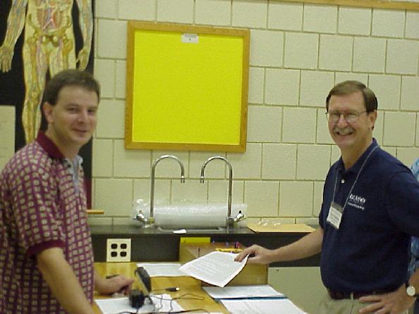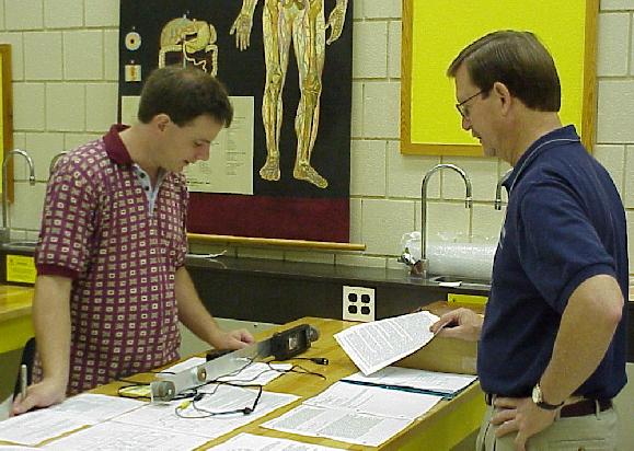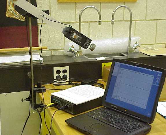 Pendulum with force and angle transducers, connected to interface and laptop.