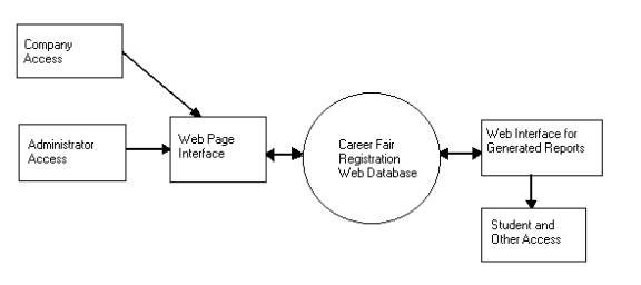 The current system in place is a CGI (common gateway interface) web page that simply emails the information submitted to Jan Ford. The new system will use ASP (active server pages) to interface to an online database, storing all the information to be searched through and even printed out into a career fair booklet in the end. The new program will most likely only be used for the Rose-Hulman career fair registration, although it could be modified slightly to be used for other similar projects if necessary. The context diagram for this project can be found in figure 1.2.2a.