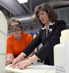 Dr. Luanne Tilstra working with a student in a laboratory.