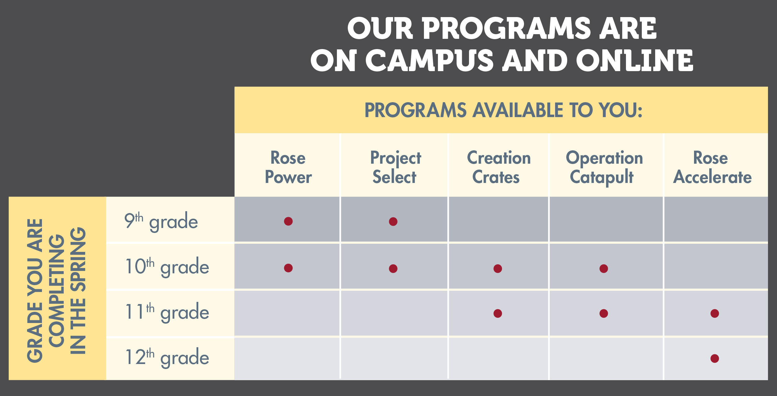 Rose Accelerate (for grades 11-12 and eligible first-year college students): Expand your knowledge by taking core college coursework online this summer and earn credits toward your Rose-Hulman degree.