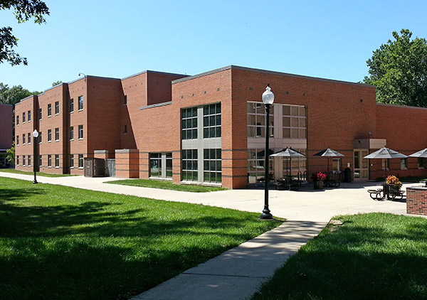 The first LEED Silver-certified campus building, this 240-bed, 75,000-square-foot residence hall located on the west edge of campus is packed full of energy-efficient amenities that reflects the institute’s commitment to sustainability. There are two wings that extend out at slight angles from a glass-enclosed center corridor. Its northern-facing stairwell also is a wall of glass, and every apartment- or suite-style room has large windows – showcasing that natural day lighting is a central feature of the hall’s design.