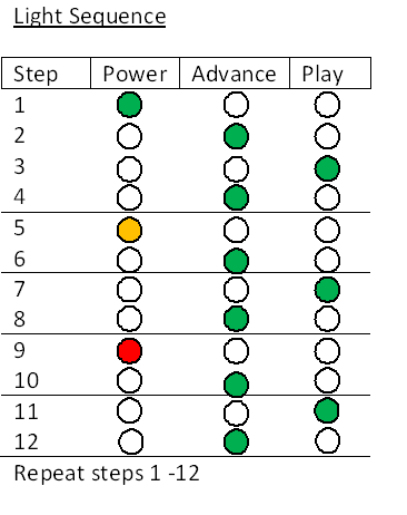 5. (10 pts) Create a function kittLights() that takes two parameters: the robot and numRepeats, and turns on the robot’s power, play and advance lights using the sequence given below. The sequence should repeat numRepeats times (see LightSequence, LightsVideo.wmv). Look up the setLEDs() function in the pycreate library documentation for details on how to turn on Create’s LEDs. For example: