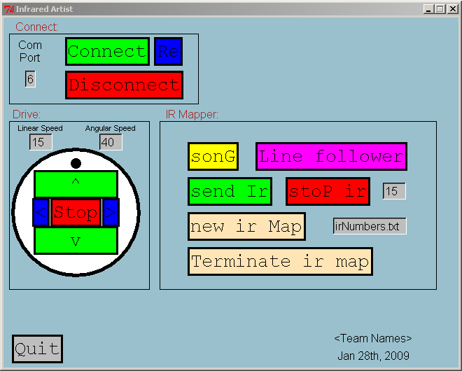 This is just a sample of what my GUI looked like.  You can use the given layout or make your GUI look different, but you shouldn't waste hours moving rectangles.  Focus on the interesting parts of the project, like IR Mapper. The capital letter shows the quick key for each button.