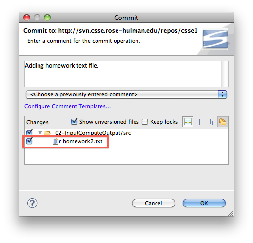 4. If your project is under version control, you should add the new text file to your repository for safe keeping. To do that, right-click on the project and choose Team → Commit… like you normally would to commit files. In the Commit dialog, make sure the new file is checked as shown in this figure: