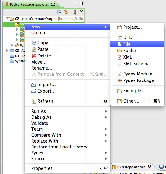 1. Right-click on the project, or folder within it, where you want to add the file. Then choose New → File as shown in this figure.