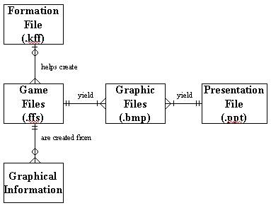 Throughout the course of a game in which the system is used, the system will collect information about play formations through graphical interaction with the user. Since the information is not needed until the game’s halftime, it can be stored in an internal data structure and virtually ignored until the formations need to be generated in presentation form. The system will maintain a list of frequencies for common plays and thus be able to show the most common formations, which will speed up selection. The user can select formations that closely match the current play and easily modify them to create new plays. Finally, the system will also maintain a file of all known formations (simply positions in a grid). The relationships between these data are shown below in the Entity Relationship Diagram.