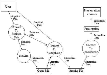 When the program starts, all known formations and frequencies of use will be read from a file. During a game, the system will read data from a grid on the screen as the user configures the players into formations. The data will then be stored in a data structure until it is either exported to a file or processed and placed into a media presentation. The bulk of processing takes place in the conversion to the various file formats.