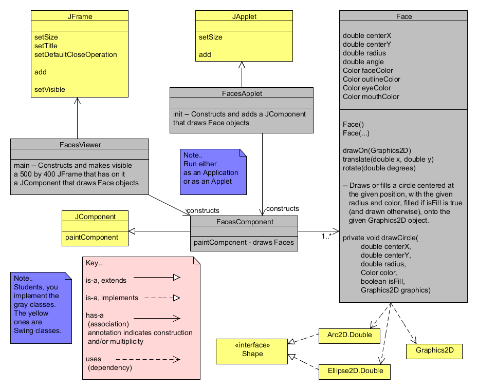 1. Examine the FacesApplet code that we supplied. Note that it is trivial to make an Application into an Applet — just a few lines of boilerplate per the example that we supplied, plus a call to the JComponent class that your Application adds to a JFrame.