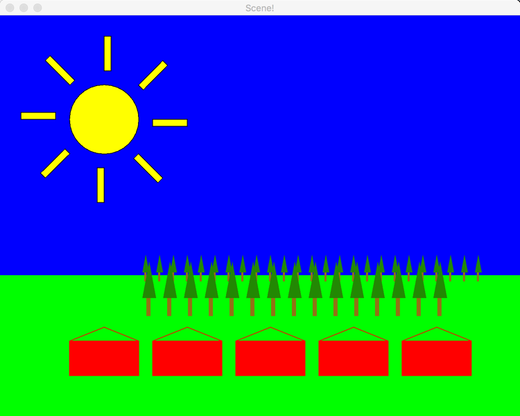 In the final stage, you will draw a scene consisting of some houses, trees, a sun, and the sky and grass in the background: