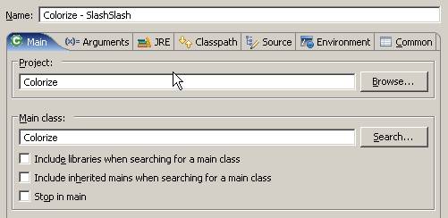 Set the name, project, and Main class to be what you want (as shown here for Colorize, if we want the SlashSlash.java file to be used as input.).