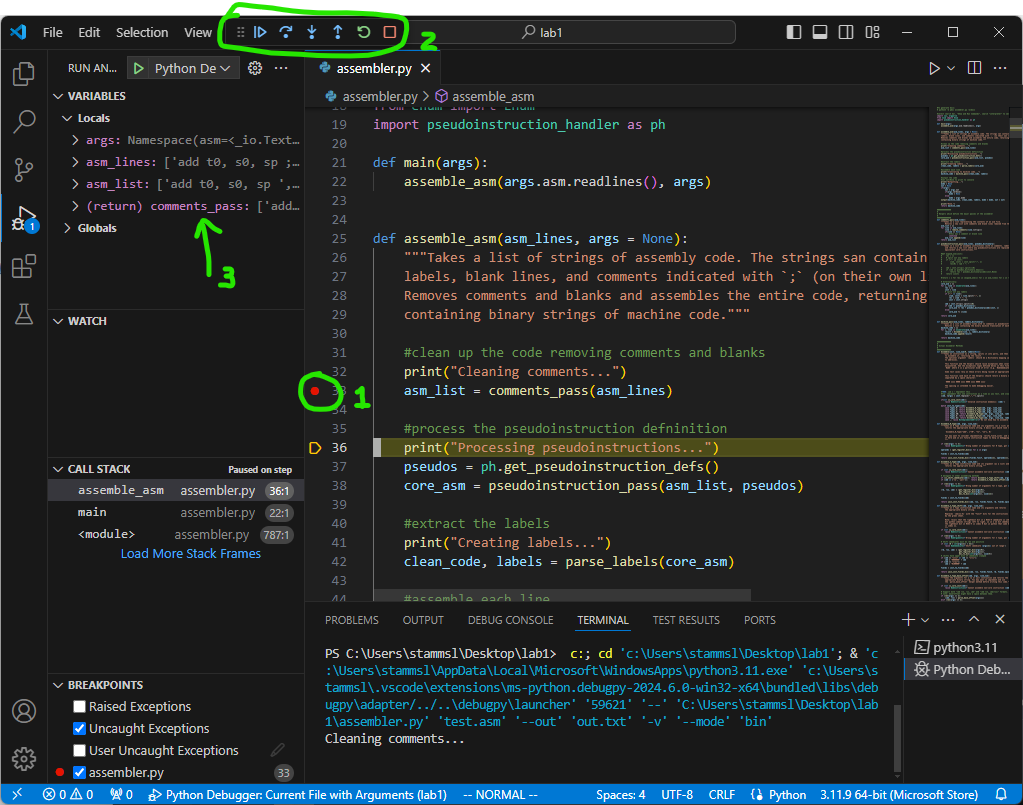 assembler.pyis the open tab in VS Code, then run the Python Debugger.
